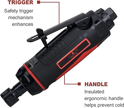 - Straight (inline) pneumatic die grinder with ¼‑inch (6 mm) collet — ideal for light grinding, smoothing, deburring, polishing, and finishing work.