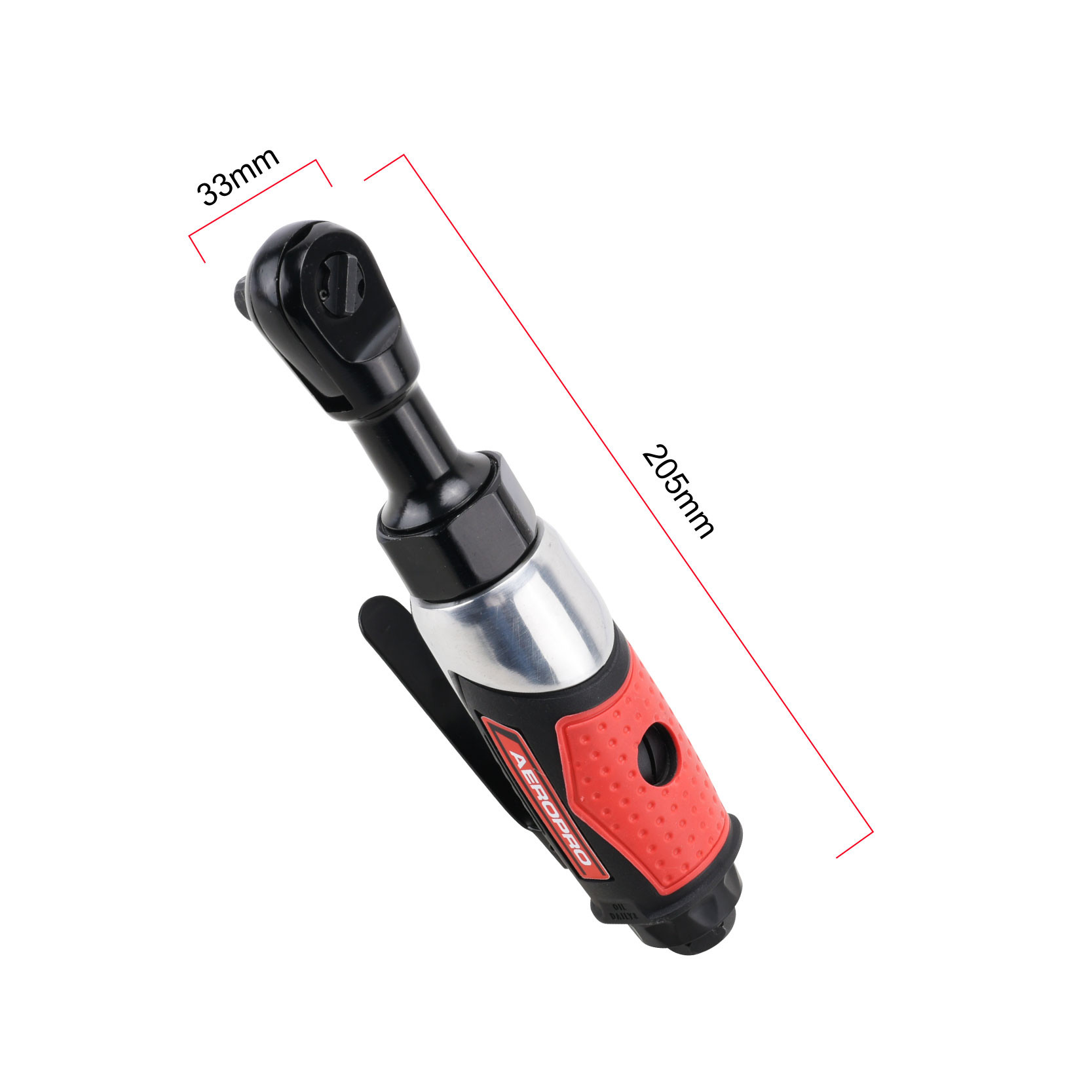- Compact pneumatic ratchet wrench with ¼″ square drive, ideal for tight spaces such as engine bays or service compartments.