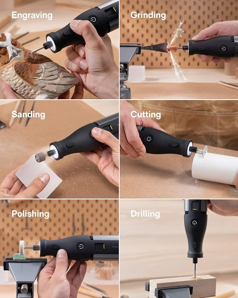 - A 12 V cordless rotary tool kit designed for crafting, engraving, polishing, sanding, drilling and other precision or hobby-DIY tasks.