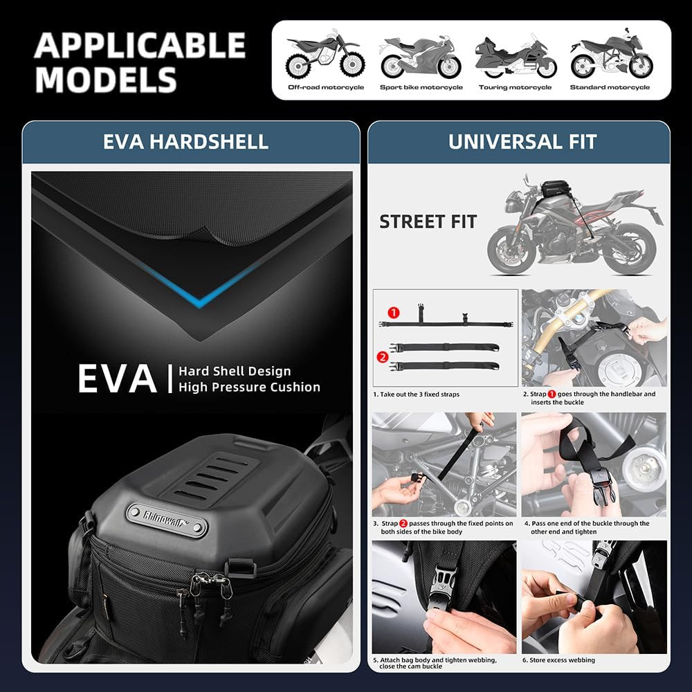 - Expandable Internal Capacity: This fuel tank bag has sufficient storage space, which can be expanded from 15L to 18L to perfectly accommodate the motorcycle riding accessories you need (gloves, glasses, phone, rechargeable battery, etc.)