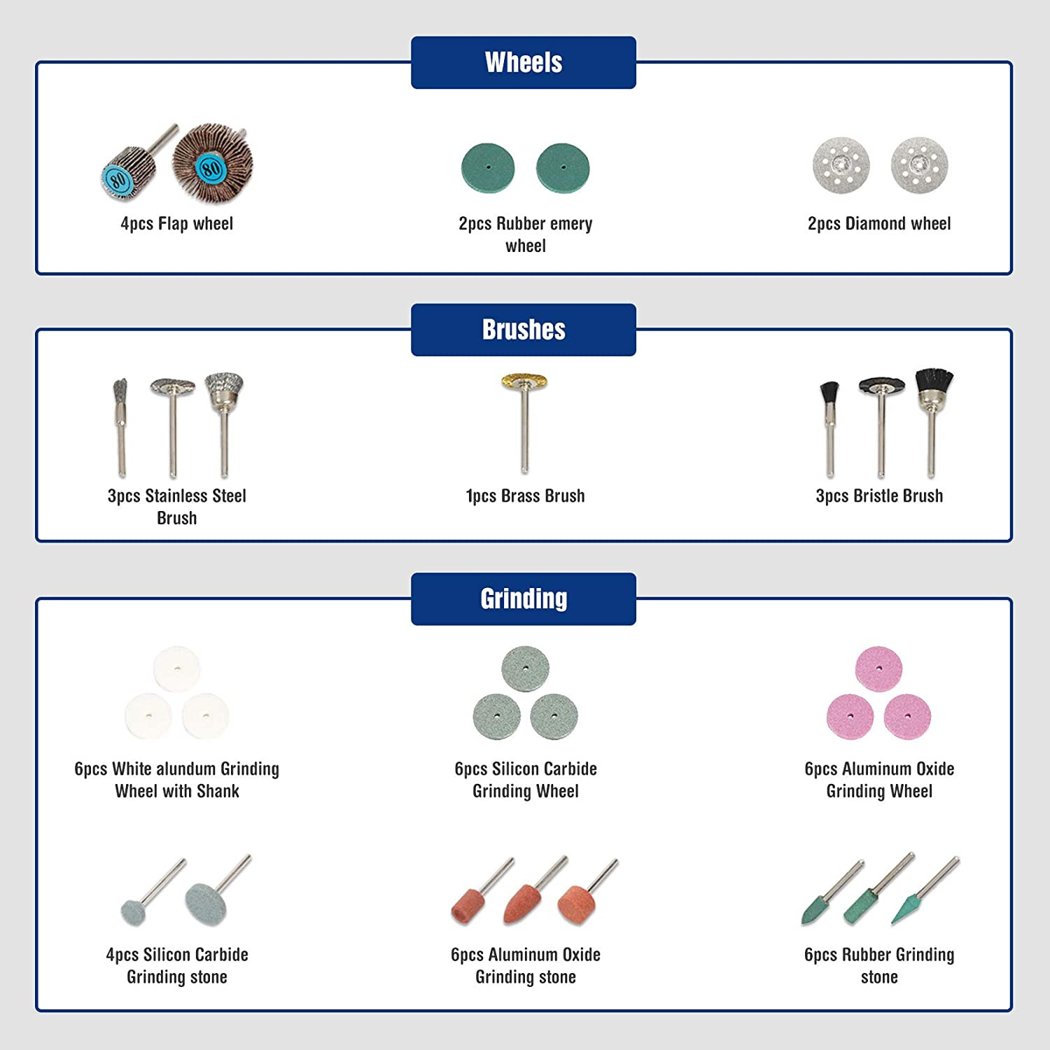 This kit includes complete rotary tool accessories of cutting, grinding, sanding, sharpening, polishing, engraving, drilling, cleaning, meet your various DIY application requirements