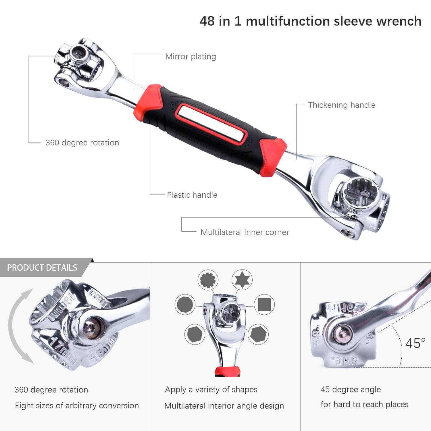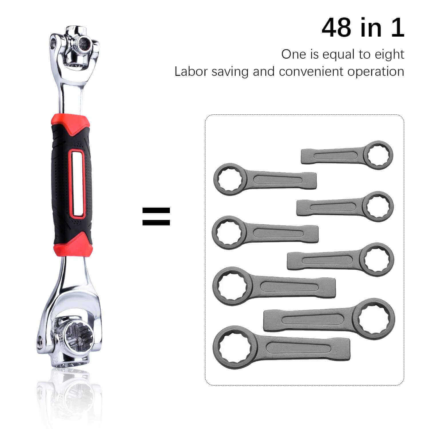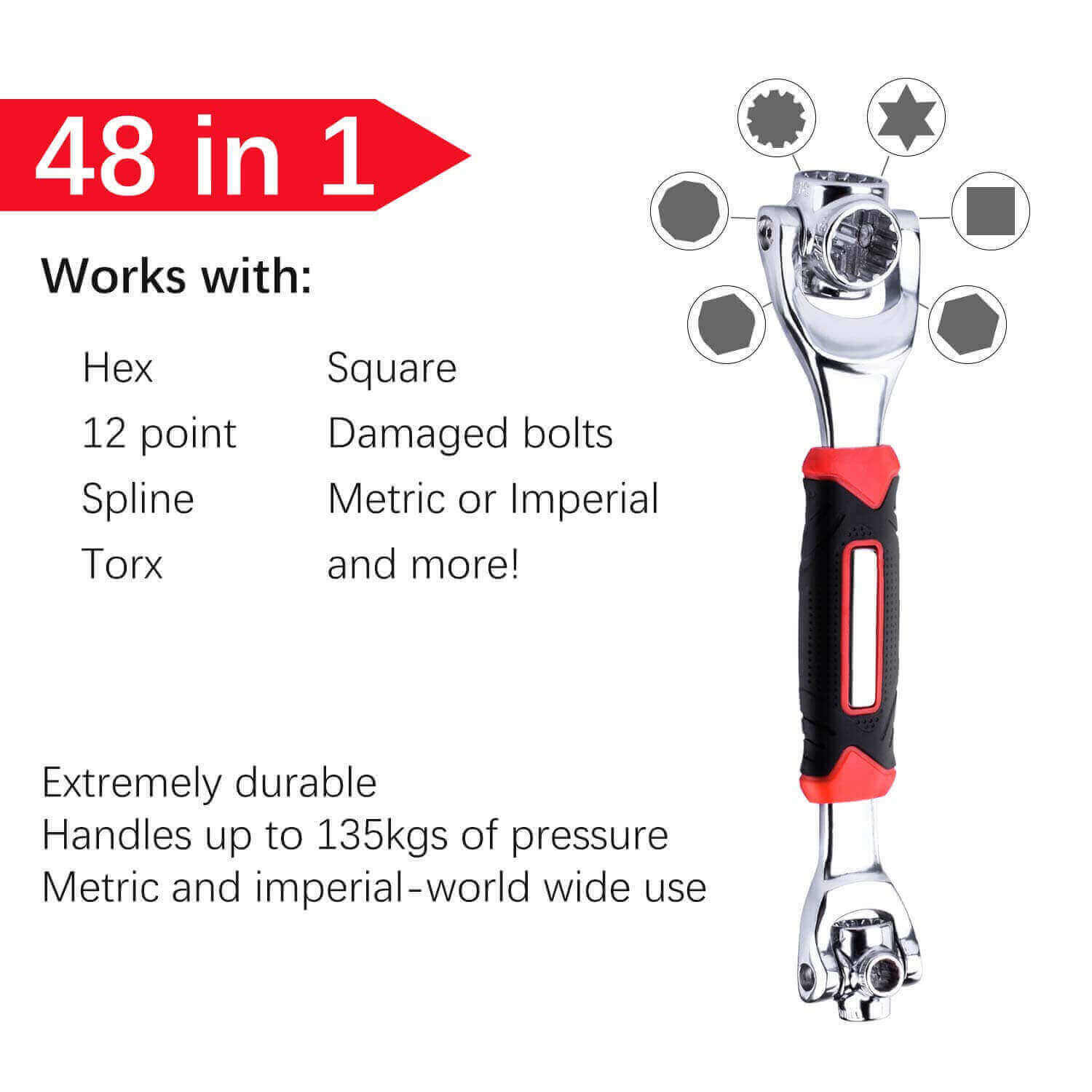 The tiger wrench combines 48 tools into one swiveling head and rotating adjustments let you find the size you need quickly and easily at any angle no guesswork means you save time replaces big, bulky socket and wrench tool kits works with Spline bolts, 6-point, 12-point, Torn, square and even damaged bolts.
