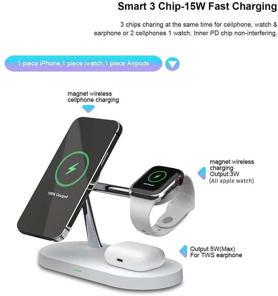 - Charge All Your Apple Gear, At Once: Charge your iPhone, Apple Watch, and AirPods simultaneously with our MagSafe 3-in-1 Wireless Charger. There's a 15-watt MagSafe wireless charging dock for your new iPhone, a magnetic charging module for your Apple Watch, and a pad for wirelessly charging your AirPods.