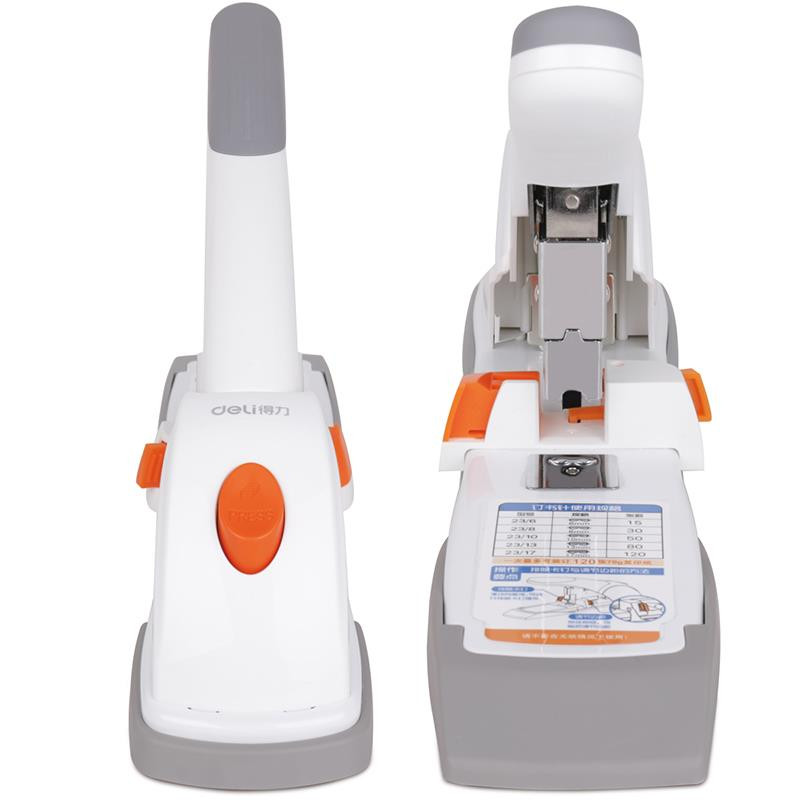 Deli E0486 120 Pages Heavy Duty Stapler has a sliding graduated mechanism for accurate stapling. Fixed anvil for permanent stapling. Maximum staples loading capacity half strip 100 staples/pins. Deli patented jammed staple remover mechanism. ABS Plastic ruler for easy adjustment of paper stapling depth. Comfort touch handle to ease stapling. Anti-skid base and 20,000 cycle lifetime.