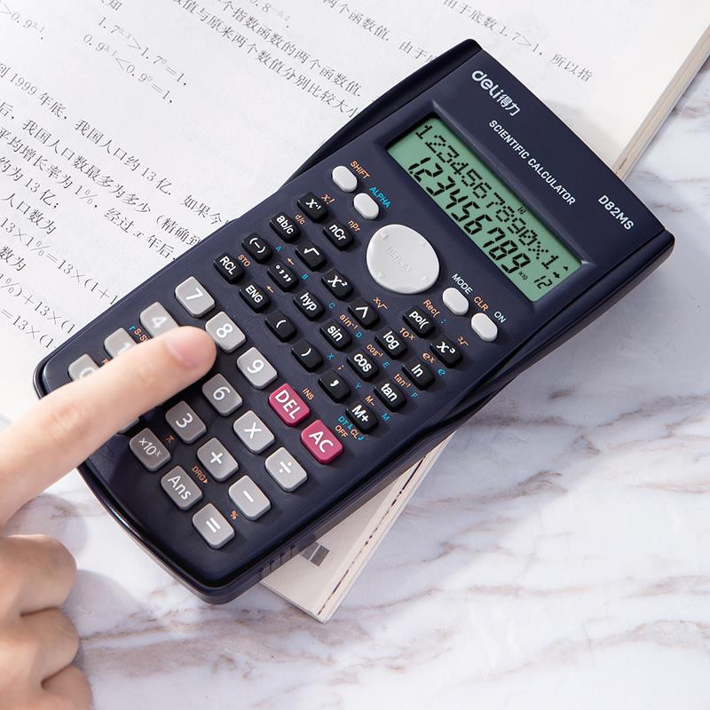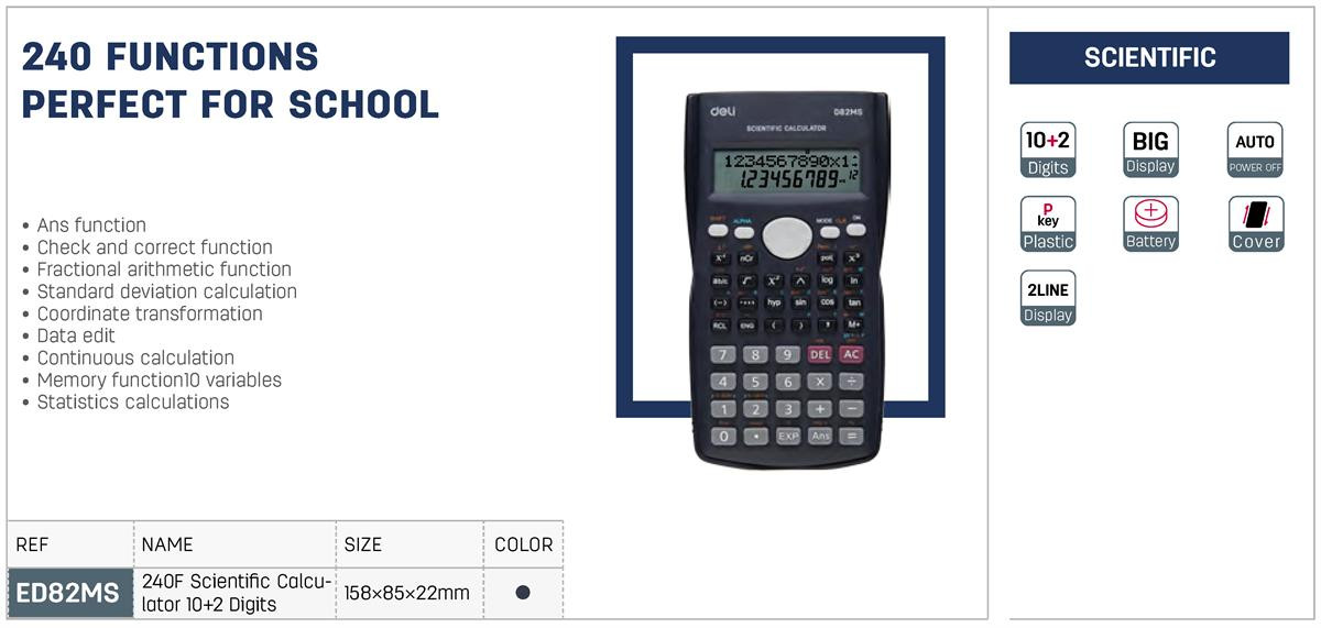 Deli ED82MS Scientific Calculator has 240 Functions and is perfect for school students. 10+2 Digits. Easy to understand and display as on textbook. Dual power Solar and Battery. 1 Million lifetime press button. Auto/Manual power off. Sliding protective cover. 2-Line display. Layer LCD. Functions: ANS function. Check and correct function. Fractional arithmetic function. Standard deviation calculation. Coordinate transformation. Data edit. Continuous calculation. Memory function 10 variables. Statistics calculations and More.