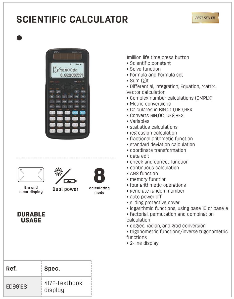 Deli ED991ES Scientific Calculator has 417 Functions. Easy to understand and display as on textbook. 8 Calculating modes. Dual power Solar and Battery. 1 Million lifetime press button. Sliding protective cover. 2-Line display. Functions: Scientific constant. Solve function. Formula and formula set. Sum (Σ)t. Differential, Integration, Equation, Matrix, Vector calculation. (CMPLX). Metric conversions. Calculates in BIN, OCT, DEG, and HEX. Converts BIN, OCT, DEG, HEX. Variables. Statistics calculations. Regression calculation. Fractional arithmetic function, Standard deviation calculation. ANS function. Generate random numbers. Auto power off. Logarithmic functions, using base 10 or base e. Factorial, permutation and combination calculation. Degree, radian, and grad conversion. Trigonometric functions/inverse trigonometric functions.