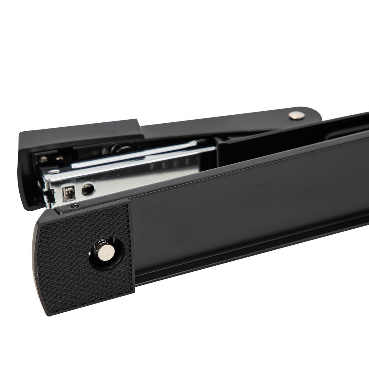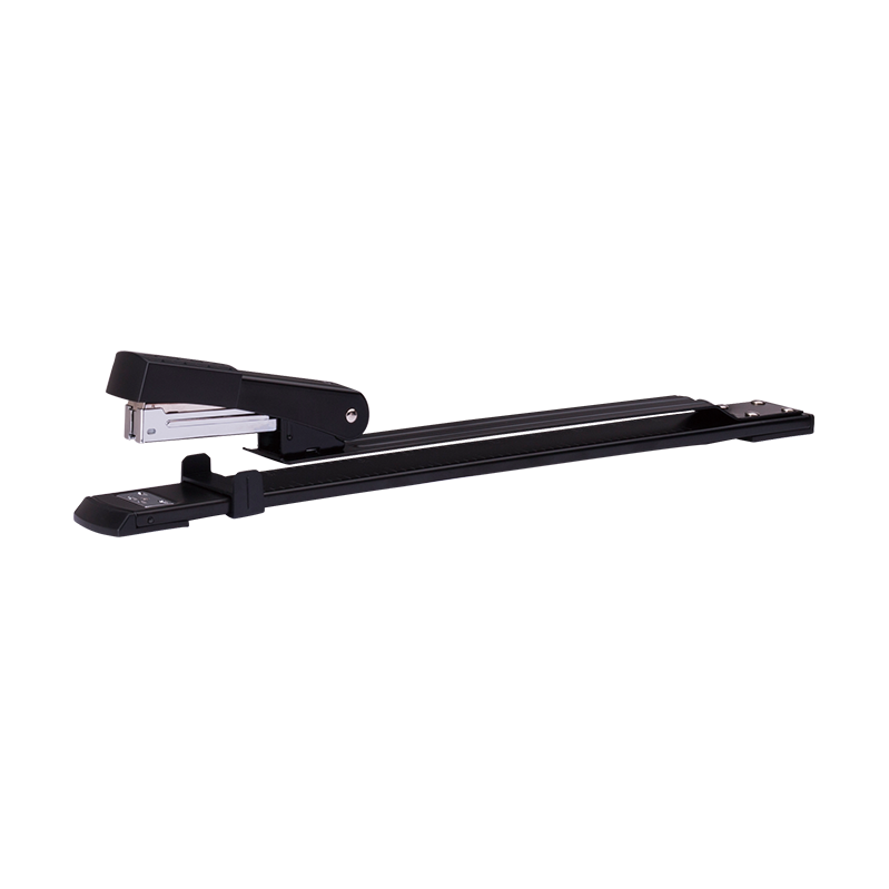 Deli E0334 Long Reach half-strip metal stapler with integrated metric and inch graduation. 310 mm Edge distance. Metal pull bar. staple up to 25 sheets of 75g. Low staple indicator. Maximum staple filling capacity one strip/50 pins. Ideal for office, school and home use. Uses stapler with 24/6 or 26/6 size staples/pins. Ergonomic design. Constructed of ABS cap, SPCC metal cover, structure and anti-skid base. Available in two assorted colours black and silver.