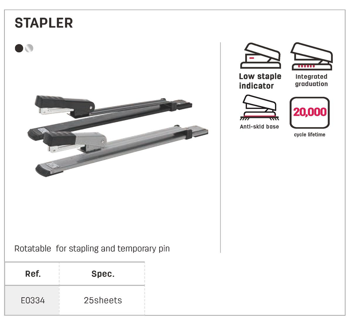 - Low staple indicator. Staple filling capacity 50 pins of 24/6 or 26/6 pins