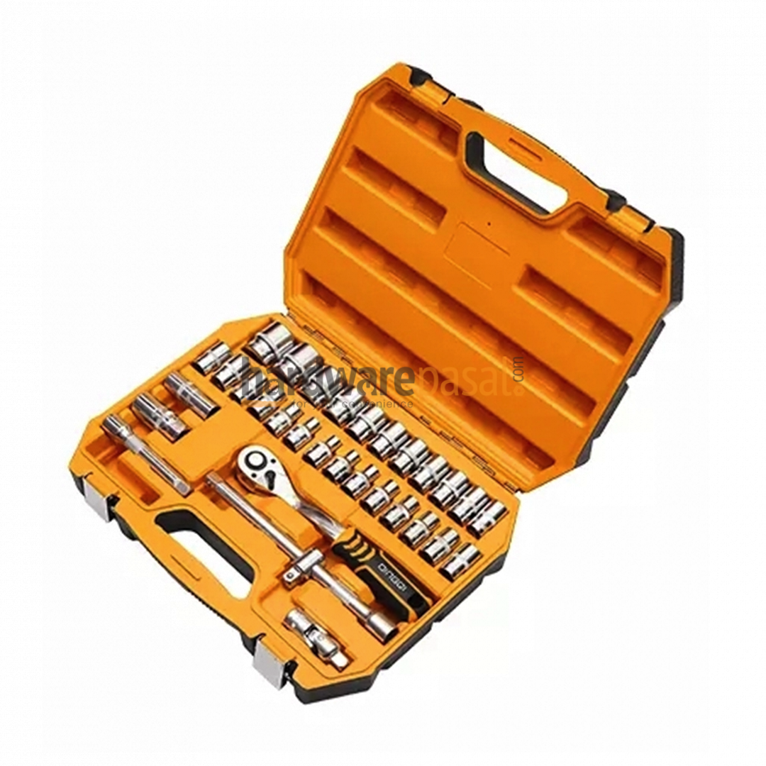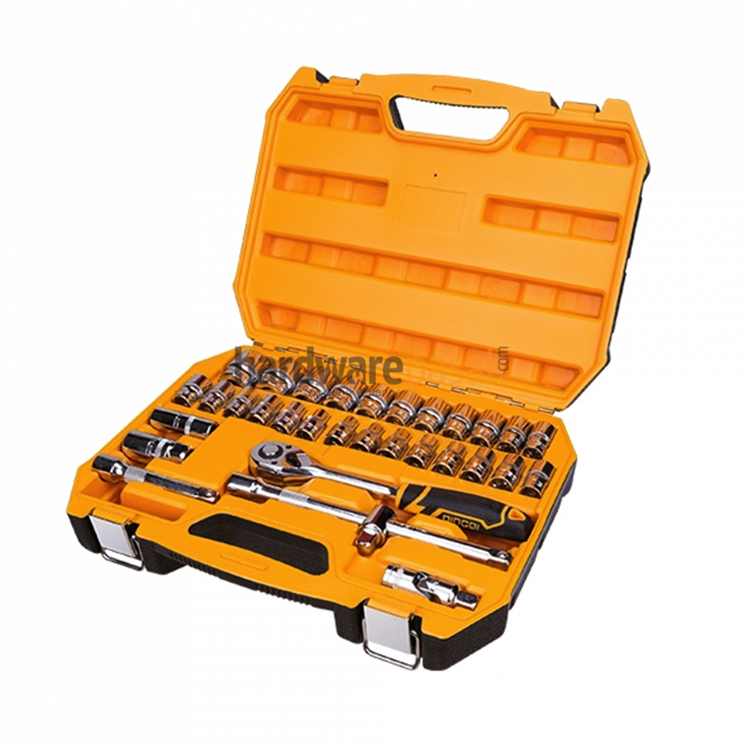 Socket wrench set provides a wide assortment of sockets sized to handle a wide range of nuts and bolts. The six-point sockets offer good side wall contact. The set comes with a tray to organize the pieces and make this set very portable.