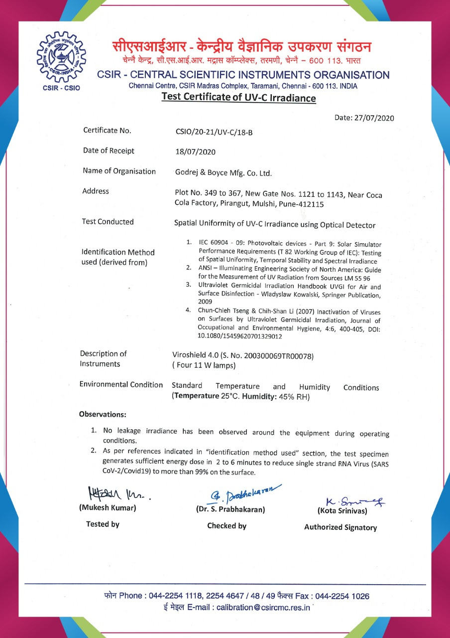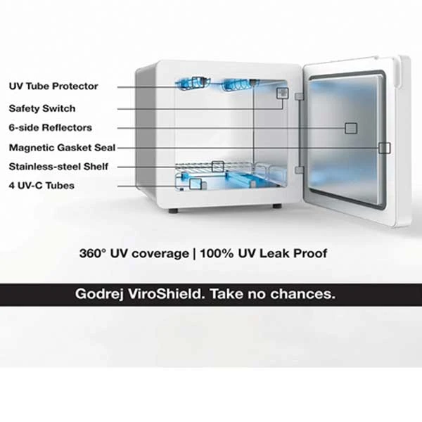 - Godrej ViroShield 4.0 can disinfect 99%+ Covid-19 viruses in 2 to 6 minutes through UV-C rays. Godrej ViroShield 4.0 has been tested and certified for UV-C irradiance by an ICMR empanelled lab.Across the world, UVC sterilization is an established scientific method for dry killing pathogens, viruses and bacteria including SARS-CoV-1. While there is no microbiological test study against Covid 19, UV-C disinfection is prolific and clinically accepted for Covid 19.