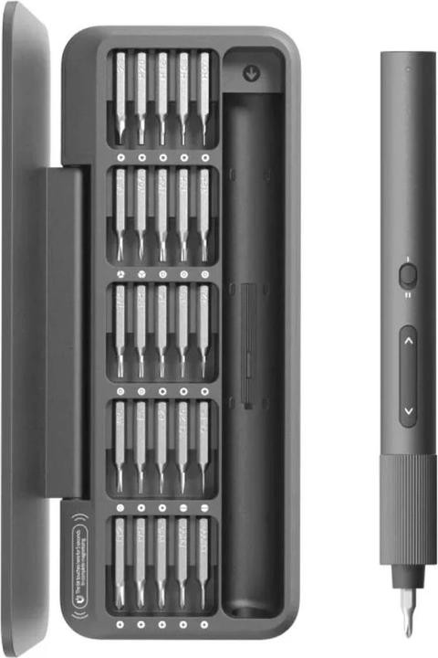 - Precision electric screwdriver with 25 magnetised S2 steel bits for electronics and small-mechanical tasks.
