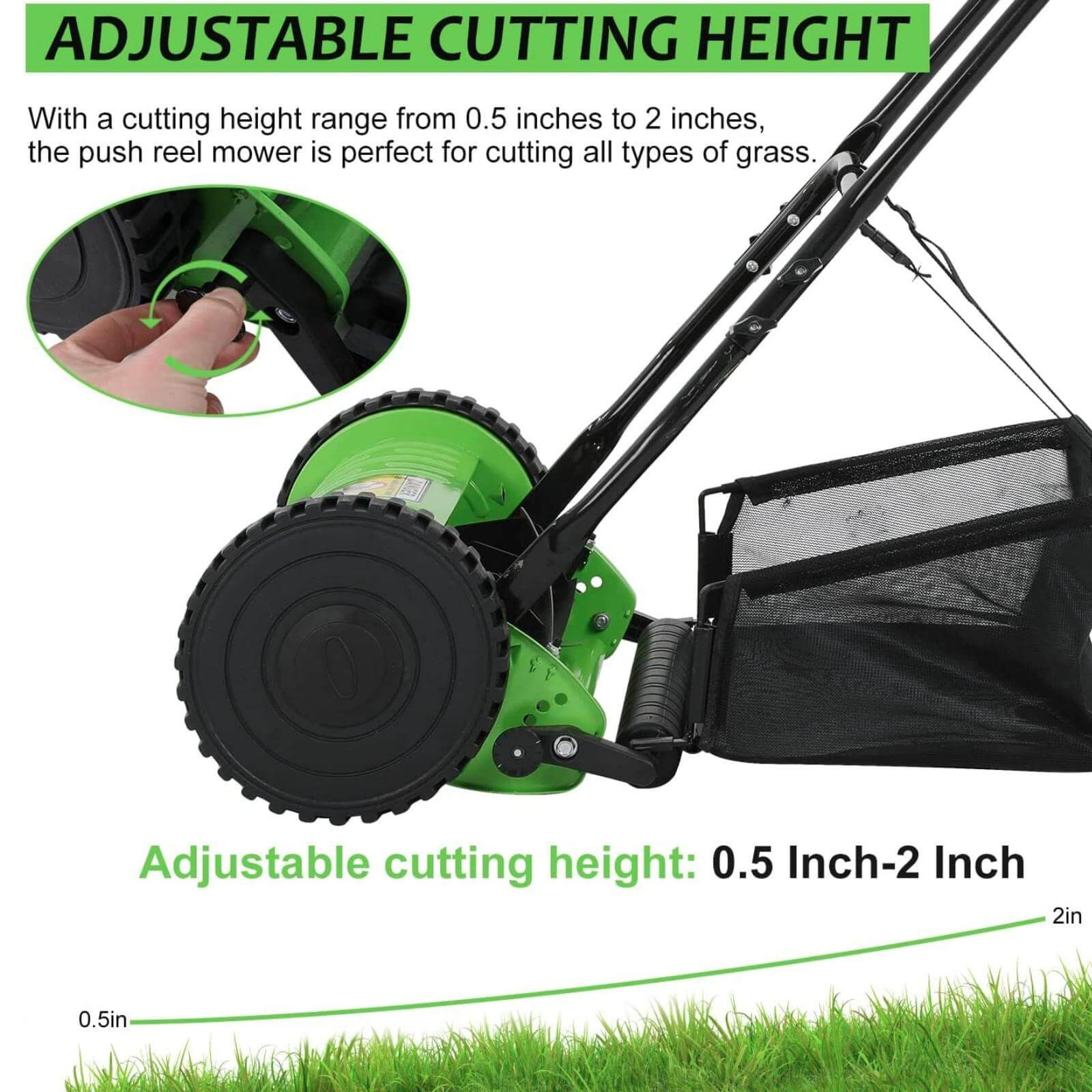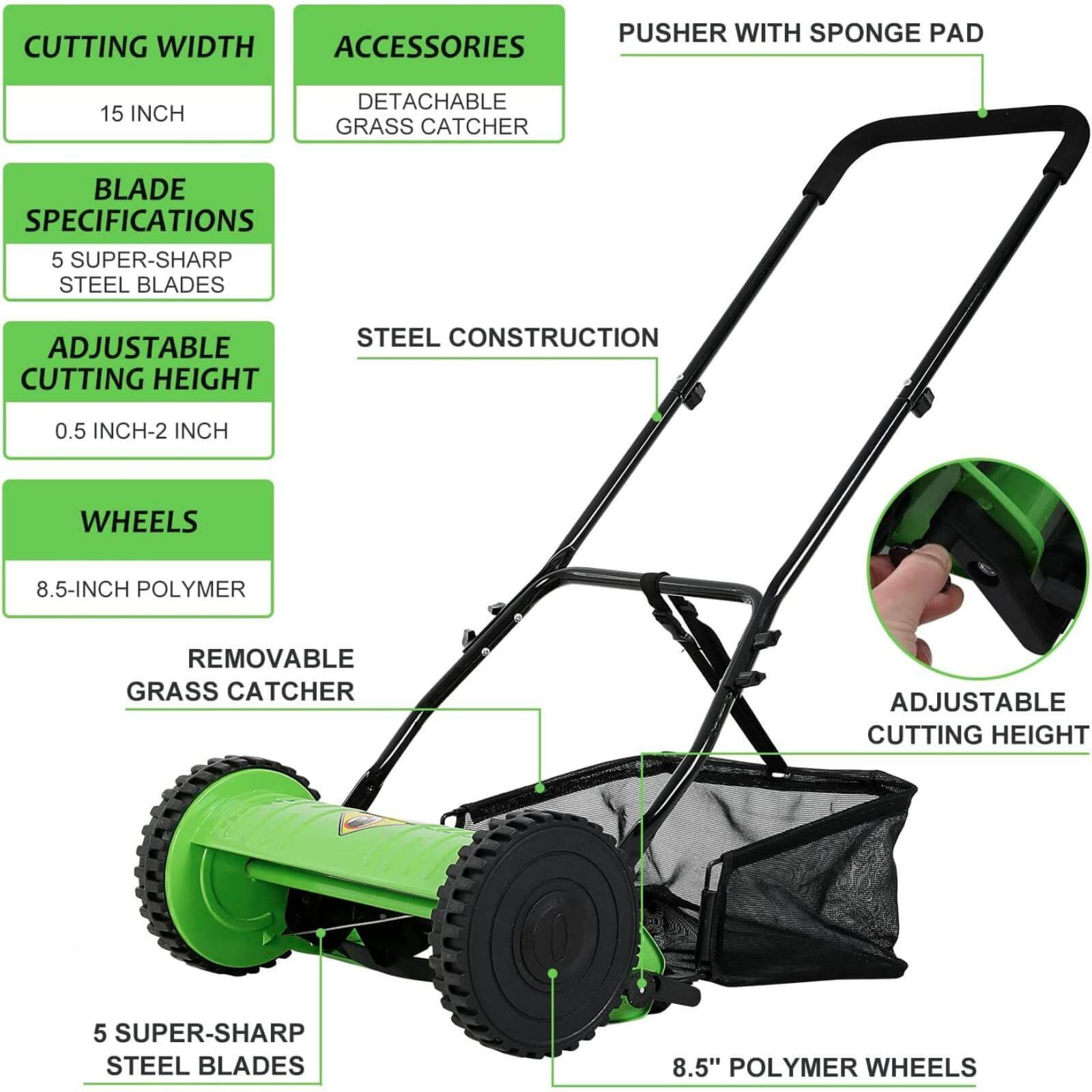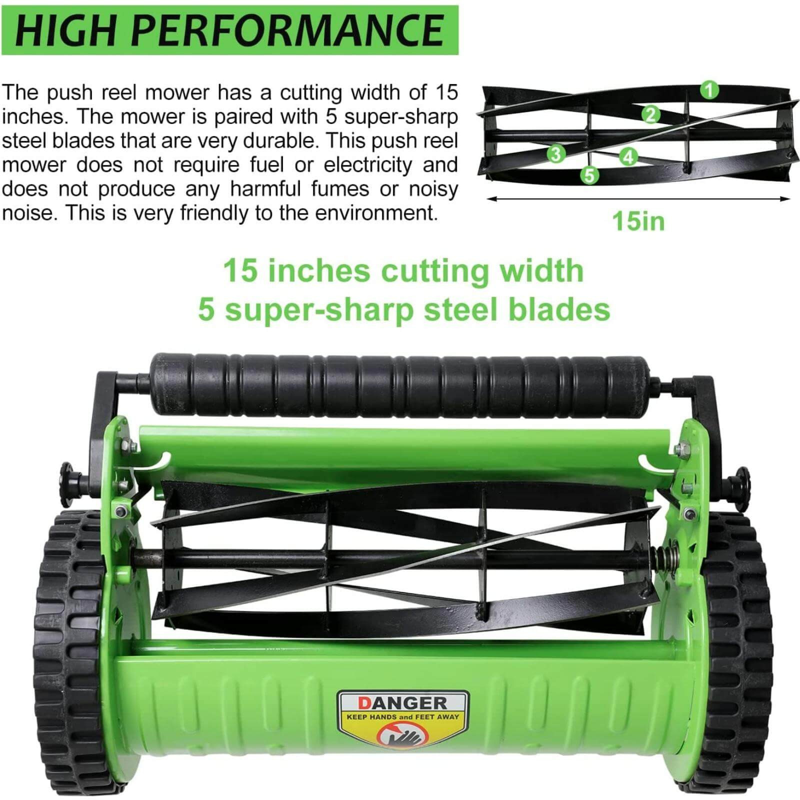 - The push reel mower has 5 sharp steel blades made of heat-treated alloy steel that will stay sharp for years.