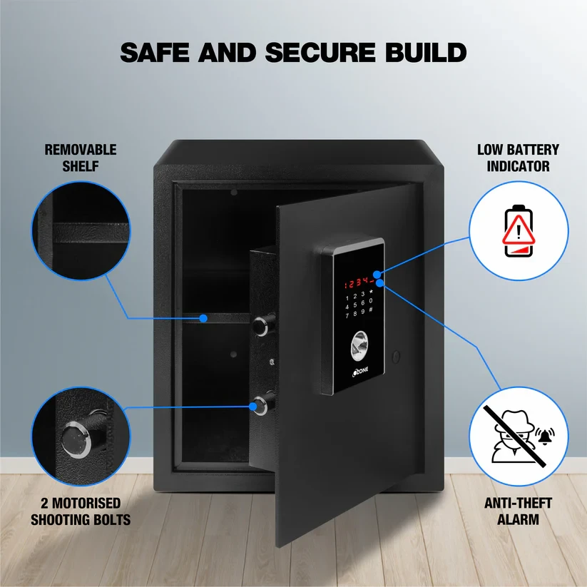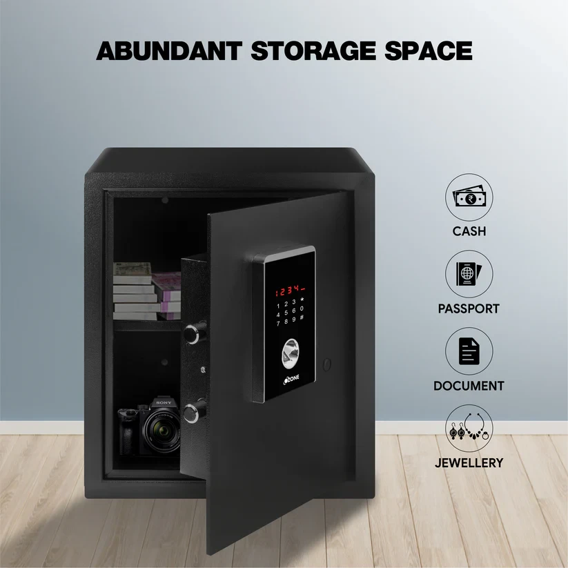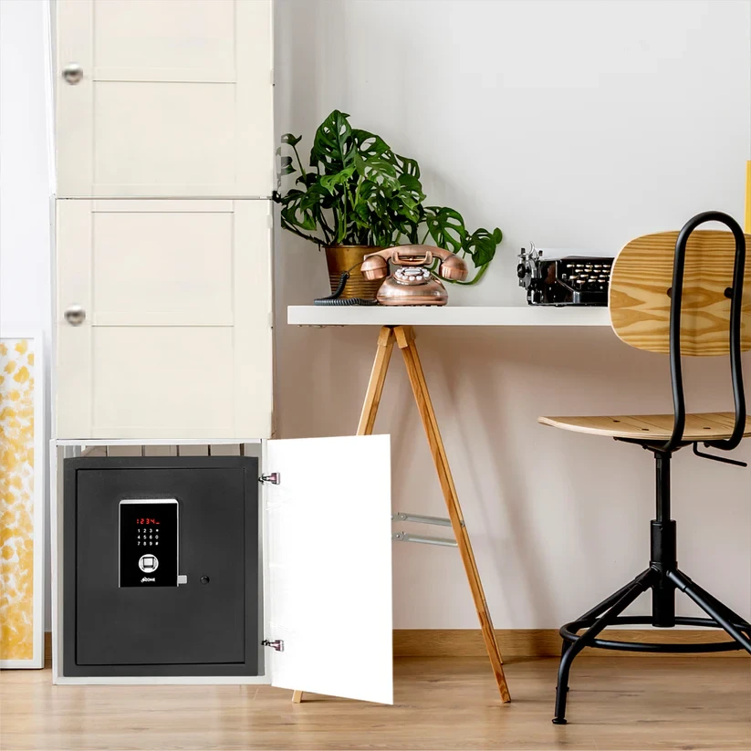 If you do not want to disclose your password, use the asterisks key on the operating panel to hide the code - The safe allows for the storage of valuables ranging from passports to jewelry, documents, cash, watches, gold, and more. It also has an LED display for clear visibility. The safe door panel prevents careless manhandling and has motorized shooting bolts. To ensure untethered security, place this small-sized safe locker for a home anywhere on walls or cupboards