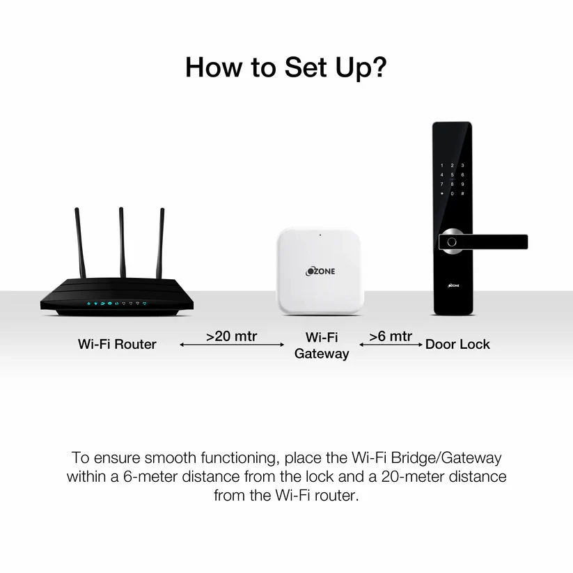 To ensure smooth functioning, place the Wi-Fi Bridge/Gateway within a 6-meter distance from the lock and a 20-meter distance from the Wi-Fi (2.4 GHz) router. Keep the Gateway powered and connected to the internet at all times for uninterrupted access around the world.