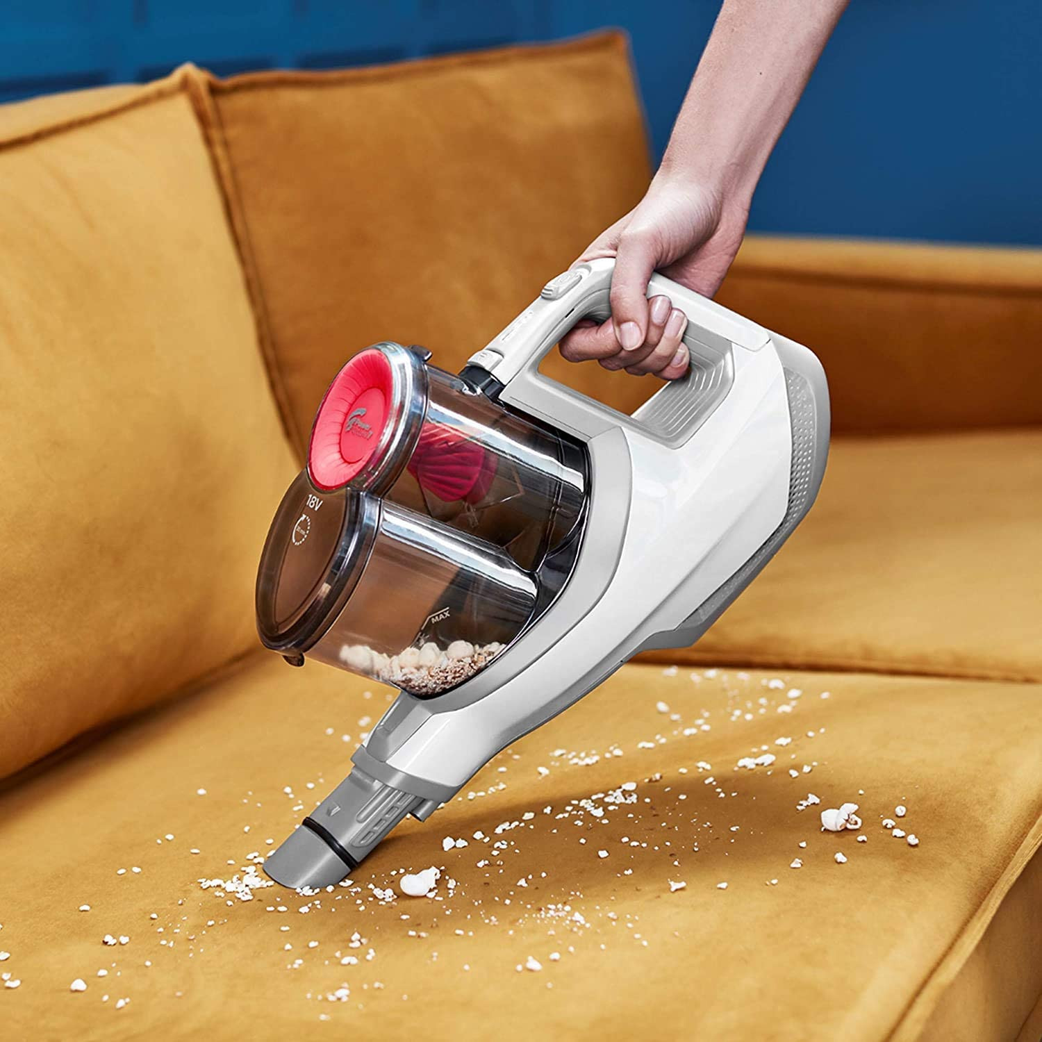 - Up to 30 min of cleaning power, with 18V Li-Ion batteries Unique dust bucket design empties without dust clouds Fast reach everywhere, even under low furniture
