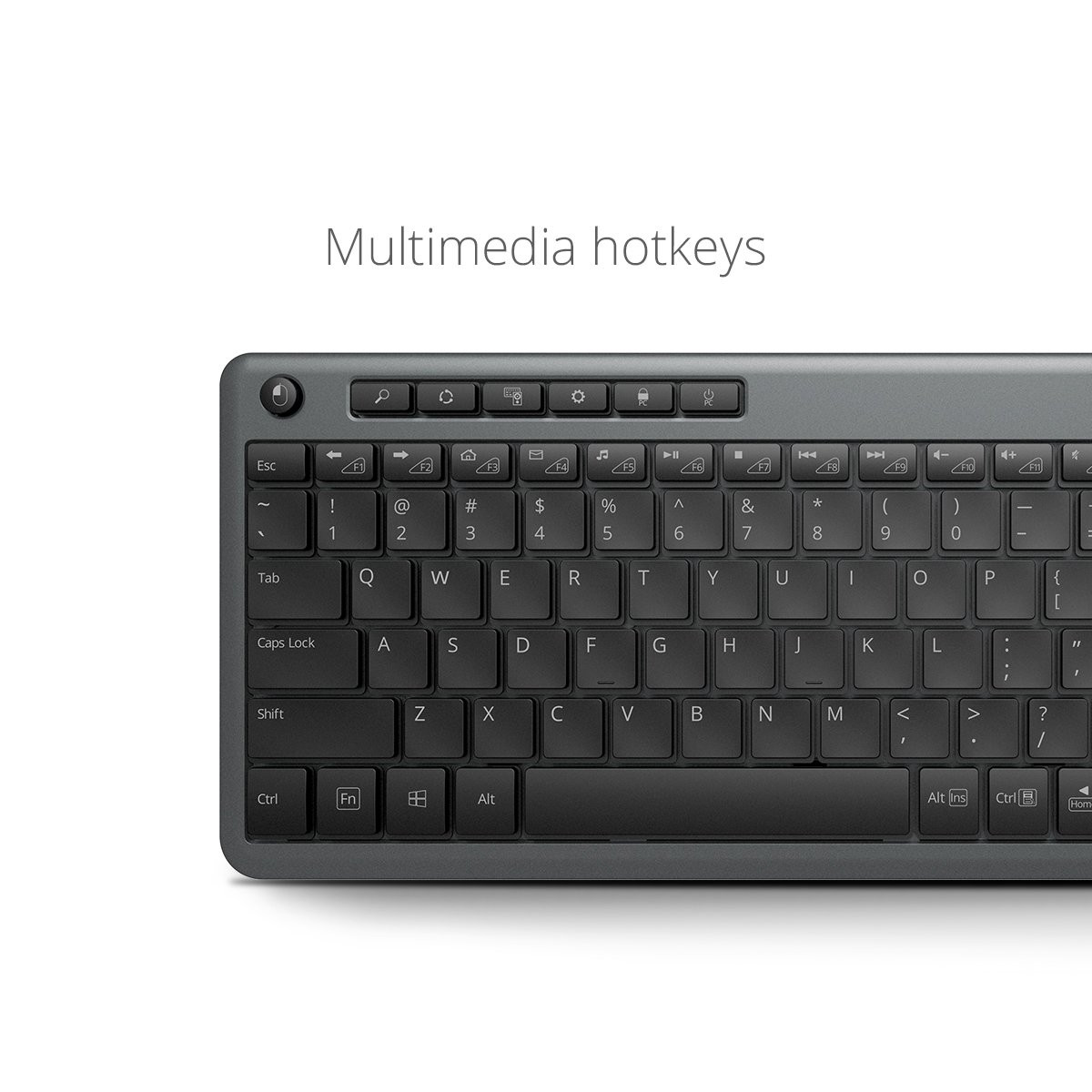 - Its ergonomic clean design adds a touch of style to any coffee table, while providing easy, convenient, and instant access to important multimedia functions with the Fn multimedia keys. What’s more, the 2.4 GHz wireless connection offers maximum freedom and range.