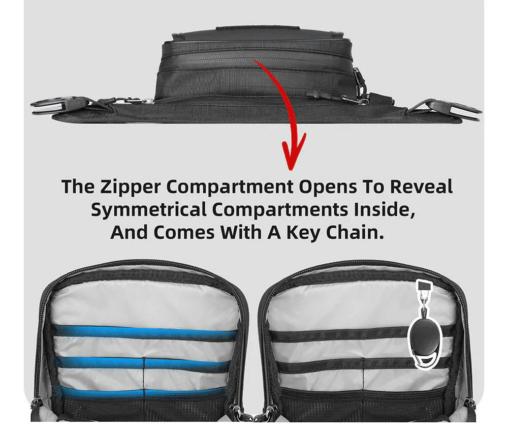 - Multi-compartment :Design with mobile phone pocket (Fix max 7 inch mobile phone);Symmetrical compartment inside comes with a key chain ; An waterproof rain cover,meet your travel needs.