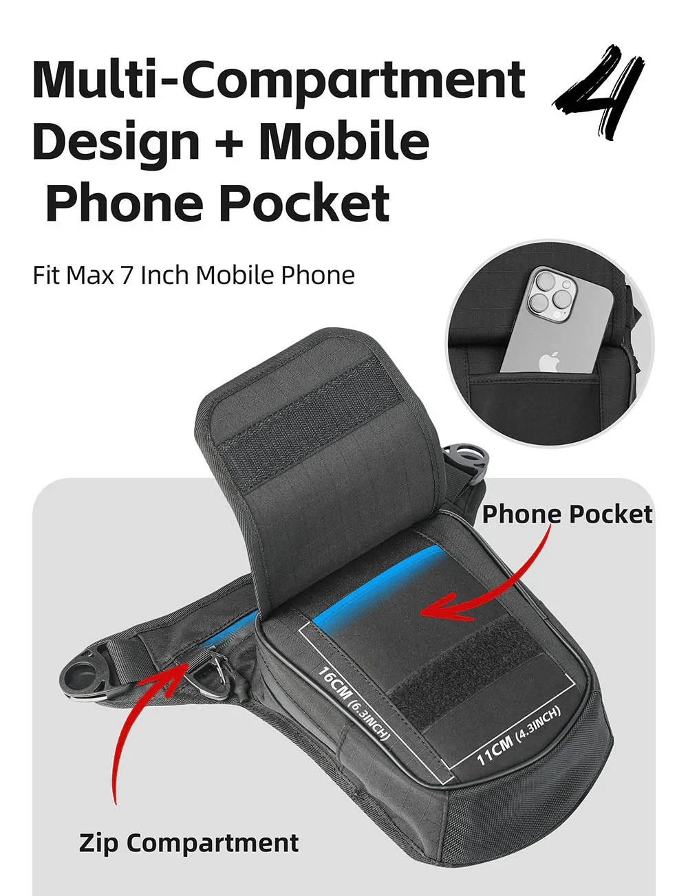 - Multifunctional bag: Equipped with many detachable and adjustable straps ,it can be used as motorcycle tank bag (applicable to tanks that can be fixed with four points),leg bag,chest bag,cross-body bag.