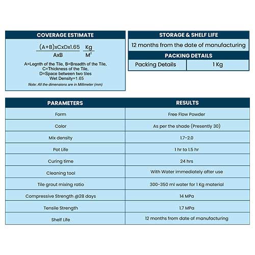 - It is suitable for grouting ceramics tiles, vitrified tiles, glass mosaics, marble, granite and natural stone.
