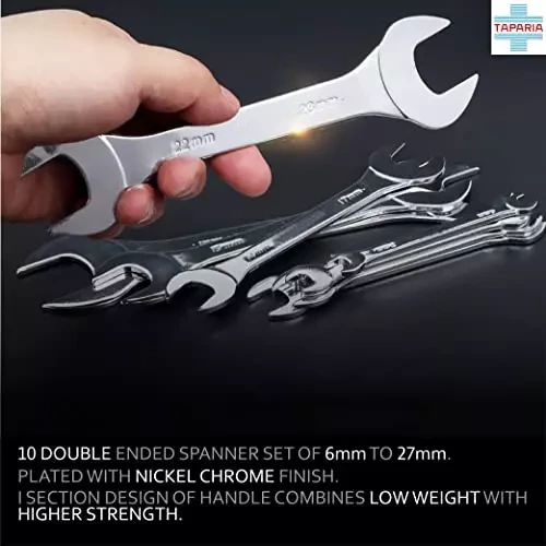 - The spanners in this set are made by Taparia, a renowned Indian manufacturer of high-quality hand tools. Taparia has a long-standing reputation for producing reliable and robust tools that meet international standards, and this double-ended spanner set is no exception. The spanners are made from premium-grade steel, ensuring their strength and longevity. The polished chrome finish adds corrosion resistance, making them suitable for use in various working conditions