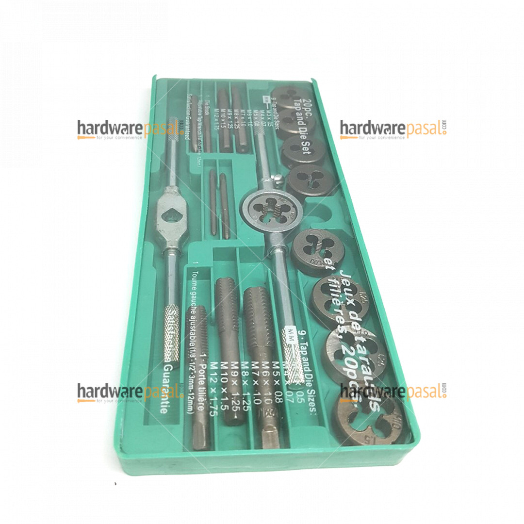 Thread tap set are tools used to create screw threads, which is called threading. Many are cutting tools; others are forming tools. A tap is used to cut or form the female portion of the mating pair (e.g. a nut). A die is used to cut or form the male portion of the mating pair (e.g. a bbolt).